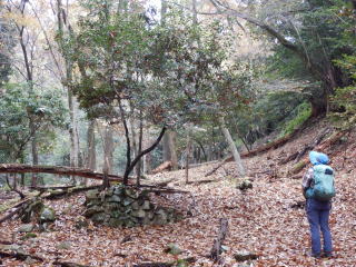 メガネ峠に登り、アップダウンを繰り返しながら石積みの前に。ヒイラギの木があり、これが目印になっている。