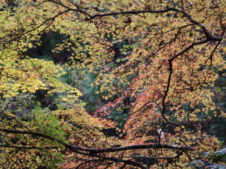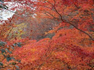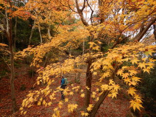 大文字山の中でも早くに紅葉したところでは葉が枯れ散り始めている。例えばモミジ坂。一方、紅葉(黄葉)が遅いところでは今が見頃。例えば、楼門の滝付近。