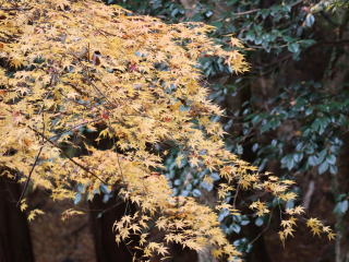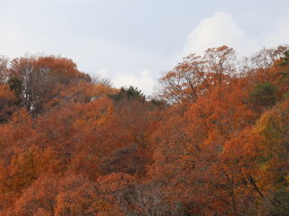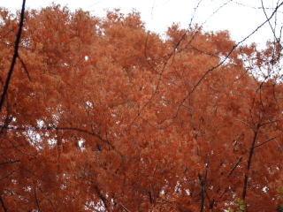 銀閣寺道でバスを降り、登山口へ。今日は平日であり、お天気もさほどよくないからか、ハイカーの数は少ない。大山出城址へは行かず、まずは中尾城趾へ向かう。メタセコイアの下を登っていたところ、珍しいことに英国人(発音で分かる)3人のグループが追い抜いていく。城址の直下の西斜面が紅葉(黄葉)の見所の一つ。少し葉が落ちている感じがするが、まずまず見事な紅葉(黄葉)。残りモミジと言うべきか。