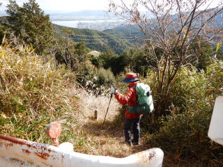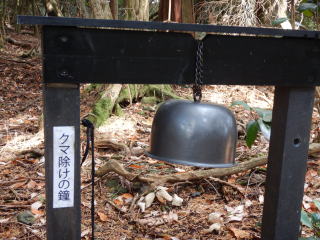 昼食後はさらに南東へと進み、長等山・三井寺と長等山・別所三角点との分岐で、われわれは古道を離れて別所三角点、テラスの方向に進む。この分岐の処に「クマ除けの鐘」があったので、一つ叩いてみたらお寺の鐘のような音がした。