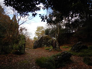 お腹も空いてきたのでこの近くの庭園跡のようなところで昼食とする。灯籠等にまじって座りやすい大石が多数積み上げられている。