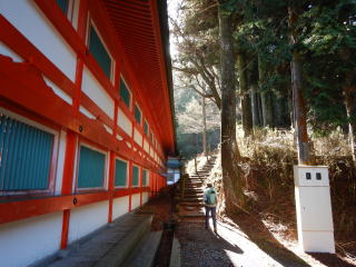 登り切ったところが延暦寺会館であと少しで一隅を照らす会館、根本中堂に到着する。会館横にきれいなトイレあり。一息入れて、脱いでいた3枚目のジャケットをはおり、いよいよ阿弥陀堂から山頂へ向かっていく。ここがまたしんどいところである。本坂ではハイカーに会わなかったが、ここへ来て、上から降りてくるハイカーが一人、二人いる。