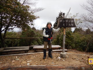 山頂では風が強く、寒い。比較的風の当たらないところのベンチで昼食とする。今日はコンビニおにぎりと甘納豆。お茶とコーヒー。食べ終わりかけたら、霙、霰が降ってきた。急いで後片付けをして出発。